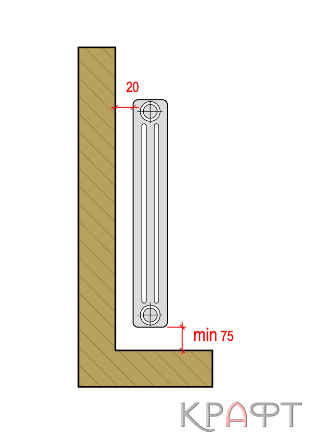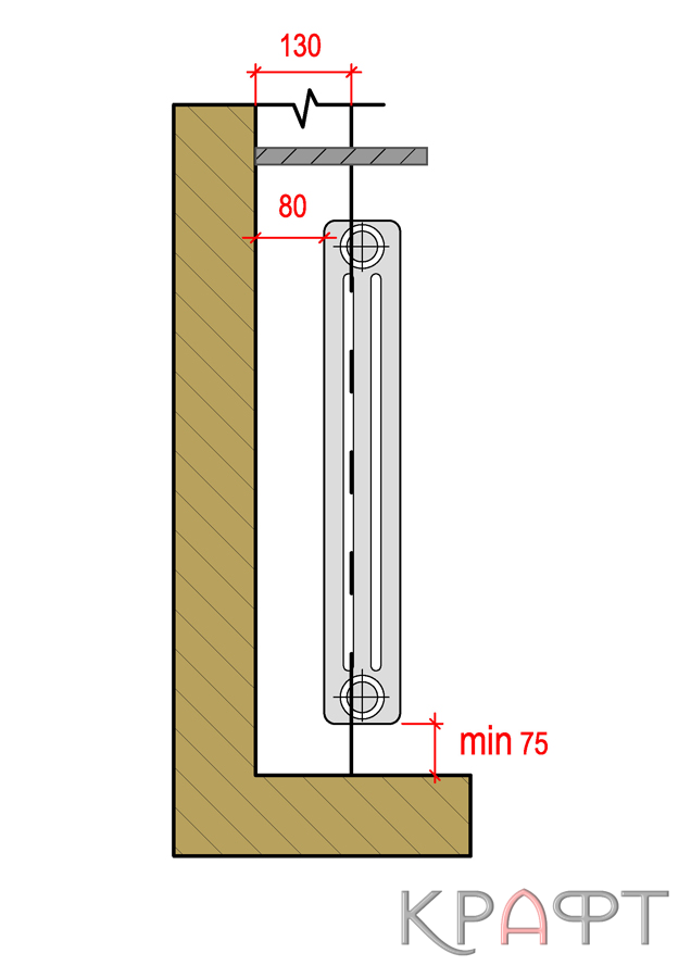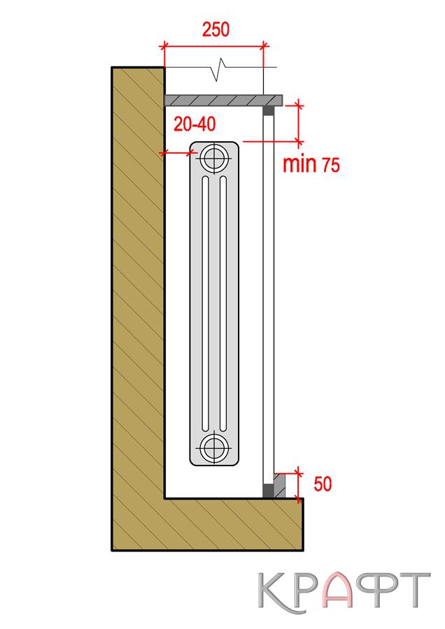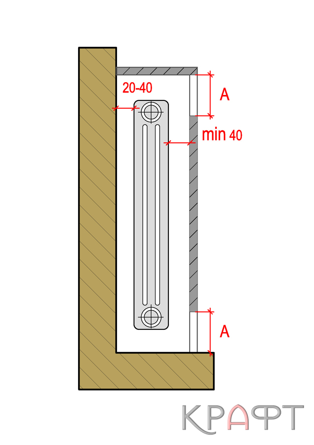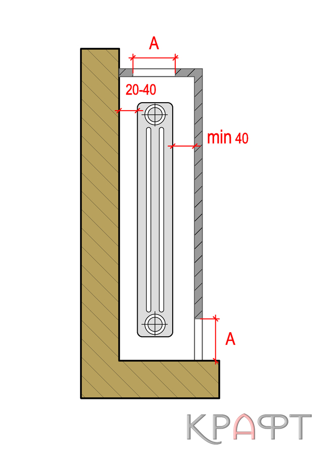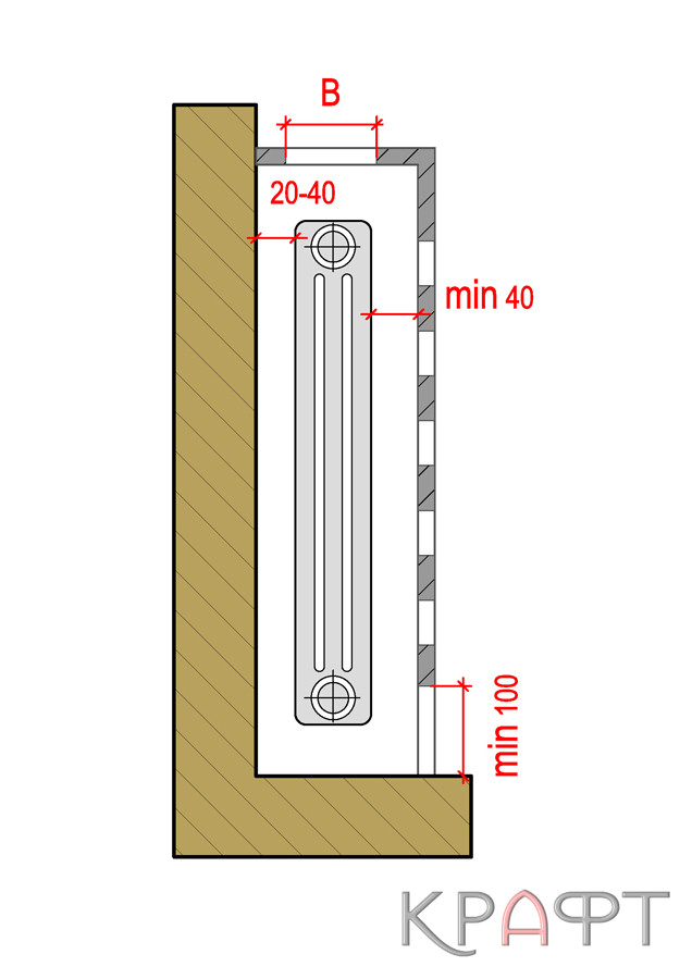 Для экономии полезной площади помещений всегда желательна установка радиаторов отопления в нишах нормальной глубины (1/2 кирпича)¹, устраиваемых в капитальных стенах здания преимущественно под оконными проемами. Высота ниши должна быть в зависимости от типа подключении прибора: при боковом подключении на 15-20 см больше, при нижнем подключении на 20-25 см больше полной высоты прибора. Важное условие чтобы между верхним и нижним обрезами ниши и прибором оставались зазоры 5-10 см и 10-15 см это условие обеспечивает нормальную теплоотдачу прибора, высокий коэффициент теплопередачи и возможность периодической чистки его от пыли. Для размещения в пределах ниши регулировочной арматуры общая длина прибора должна быть при боковом подключении на 25-30 см меньше, при нижнем подключении на 20-25 см меньше длины ниши.